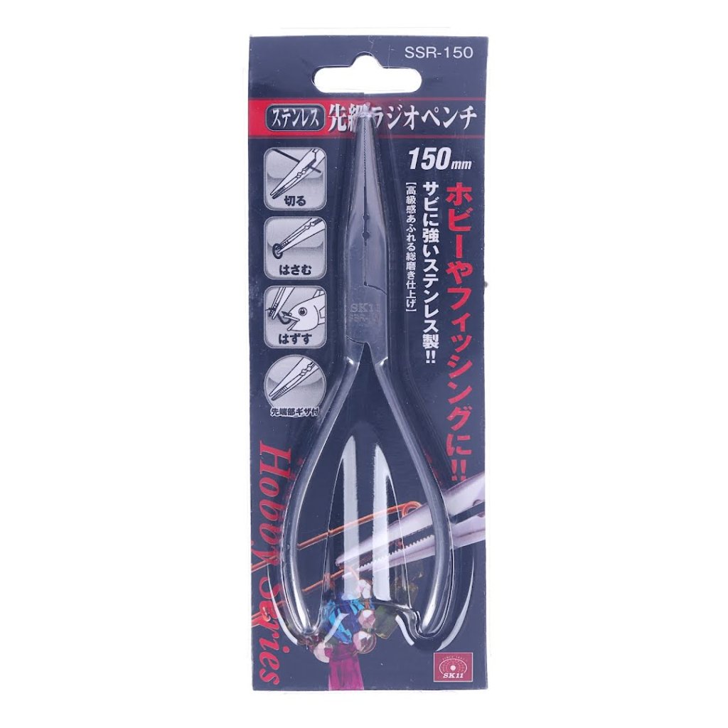 The SK11 Stainless Steel Long Needle-Nose Combination Pliers, model SSR-150, is designed for precision tasks in hobbies and fishing. This tool boasts a high-quality, polished stainless steel construction that is resistant to rust, ensuring durability and longevity. The fine, serrated tips provide a secure grip on small parts, while its dimensions (53 x 155 x 12 mm, weight 95 g) make it easy to handle. It has a cutting capacity for copper wire of 0.9 mm and a blade hardness of HRC 45-48.
