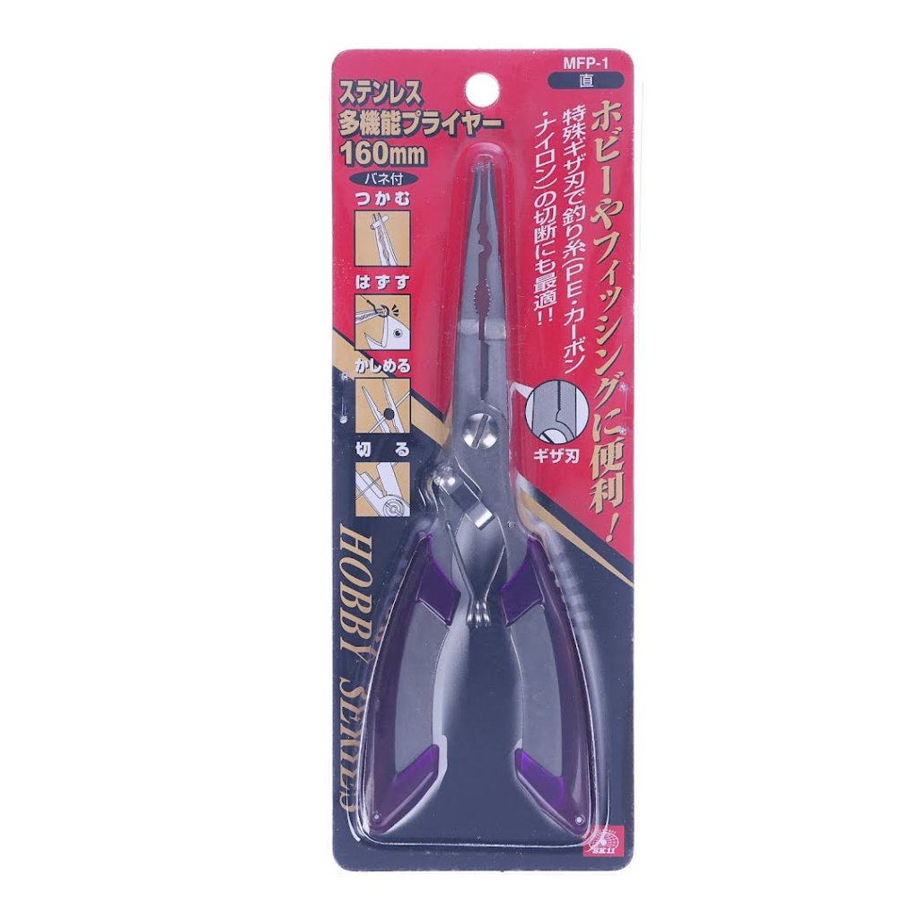 The SK11 Stainless Steel Multi Purpose Pliers, model MFP-1, is your go-to tool for various leisure activities, including hobby work and fishing. With dimensions of 54 mm in width, 166 mm in height, and 14 mm in depth, and weighing just 100 g, this stainless steel plier is designed for grabbing, crimping, and cutting tasks. Its special serrated blade is optimally designed for cutting fishing lines (PE, Carbon, Nylon), making it an indispensable tool for anglers. The plier is also equipped with a spring for ease of use and has a cutting capacity for PE, Carbon, and Nylon lines up to 0.5 mm and copper wire up to 0.5 mm, with a blade hardness of HRC 46-50.