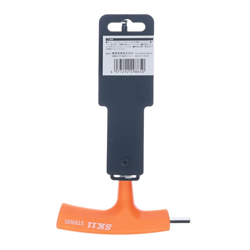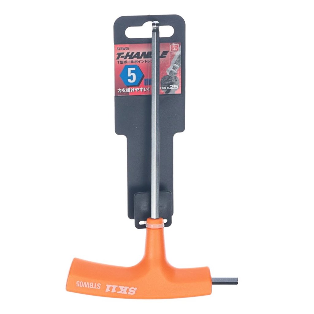 The SK11 T-Handle Ball End Hex Key is designed for efficiently tightening and loosening hex socket bolts and screws. With a ball point design, it allows for insertion at an angle of approximately 25 degrees, making it ideal for use in tight spaces and around obstacles. The tool is chrome-plated for durability and measures 5 mm in size, ensuring reliable performance for various applications.