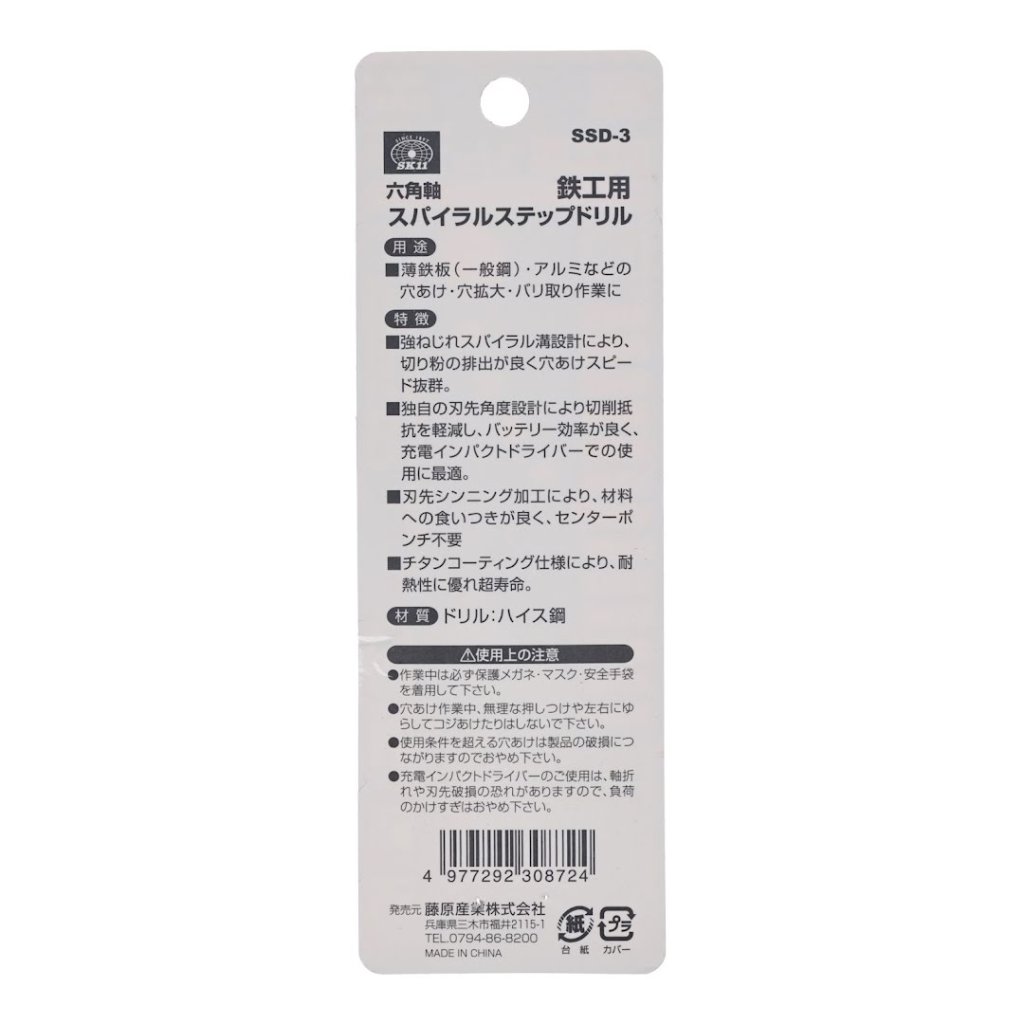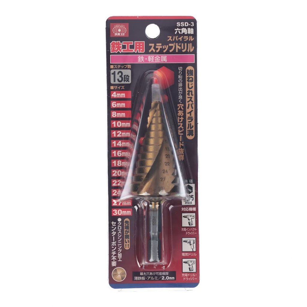 The SK11 TiN-Coated HSS Spiral Step Drill Bit, model SSD-3, is designed with a high-twist spiral groove for excellent chip ejection and rapid drilling speed. Ideal for drilling, enlarging holes, and deburring thin steel plates and aluminum, it features a unique cutting-edge angle that reduces cutting resistance and enhances battery efficiency, making it perfect for use with cordless impact drivers. The titanium coating provides superior heat resistance and longevity. It is suitable for various drilling tasks with a size range from 4 mm to 30 mm and a 6.35 mm hex shank.