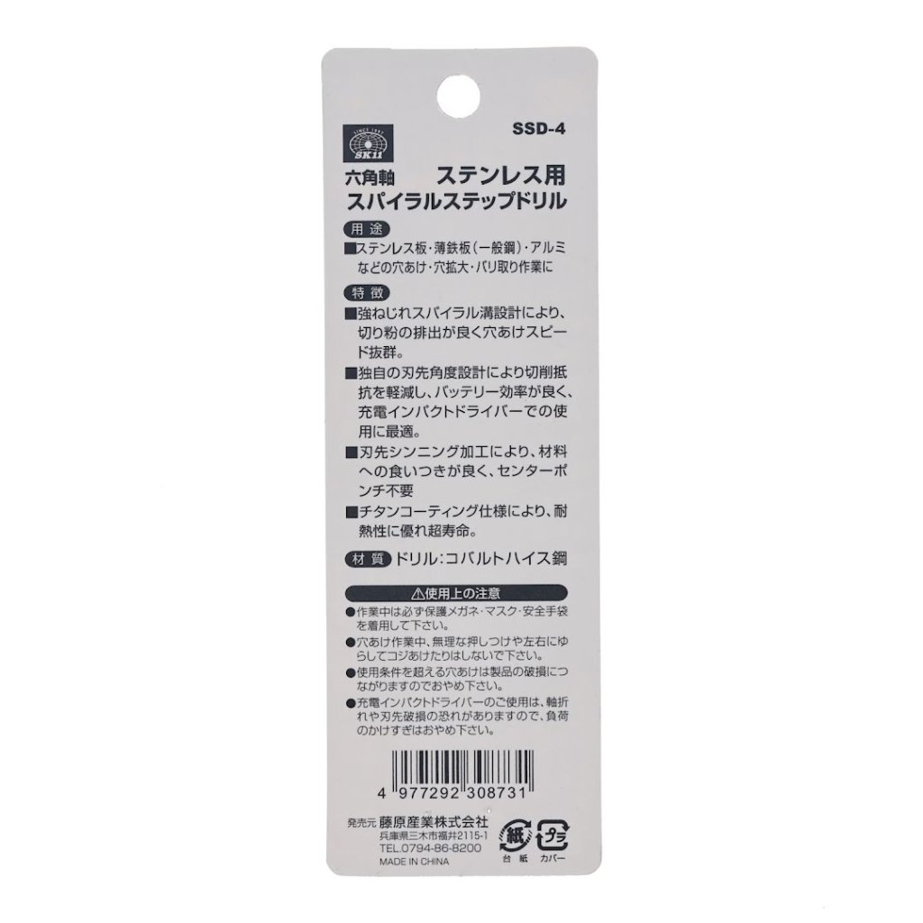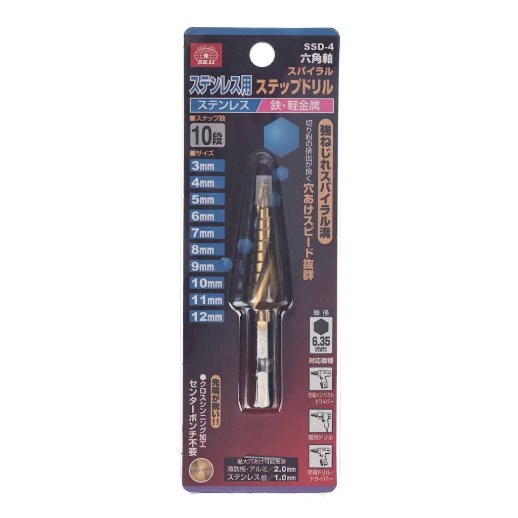 The SK11 TiN-Coated HSS Spiral Step Drill Bit, model SSD-4, is designed for efficient drilling in stainless steel, thin iron plates, and aluminum. Its unique spiral groove design ensures excellent chip removal for faster drilling. The drill features a titanium coating for enhanced heat resistance and longevity, and its unique cutting-edge angle reduces cutting resistance, making it ideal for use with battery-powered impact drivers. With sizes ranging from 3 to 12 mm and a 10-step design, it offers versatility for various drilling needs.