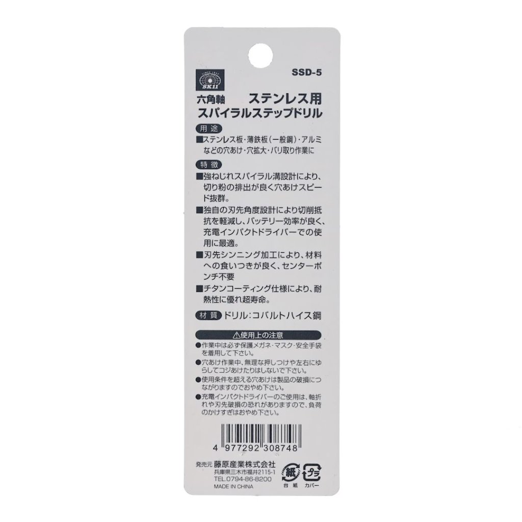 The SK11 TiN-Coated HSS Spiral Step Drill Bit, model SSD-5, is designed for enhanced drilling efficiency in materials such as stainless steel, thin iron plates, and aluminum. The unique spiral groove design ensures excellent chip removal for faster drilling. The unique blade angle reduces cutting resistance, making it ideal for use with cordless impact drivers. Additionally, its titanium coating offers superior heat resistance and longevity. The drill supports sizes ranging from 4 mm to 22 mm, with a 6.35 mm hex shank and a maximum drilling capacity of 2.0 mm for thin iron and aluminum and 1.0 mm for stainless steel.