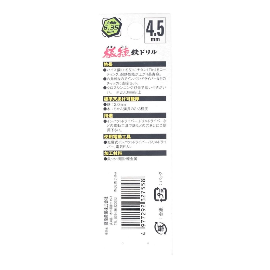 The SK11 TiN-Coated Metal Drill Bit, 4.5 mm diameter and 50 mm length, is designed for precision drilling in iron, wood, resin, and light metals. Featuring a high-speed steel (HSS) with titanium (TiN) coating, this drill bit offers enhanced heat resistance and an extended lifespan. Its 6.35 mm hexagonal shank ensures easy and secure attachment to impact and drill drivers. The drill tip is optimized for superior grip, making it easy to target and start drilling.