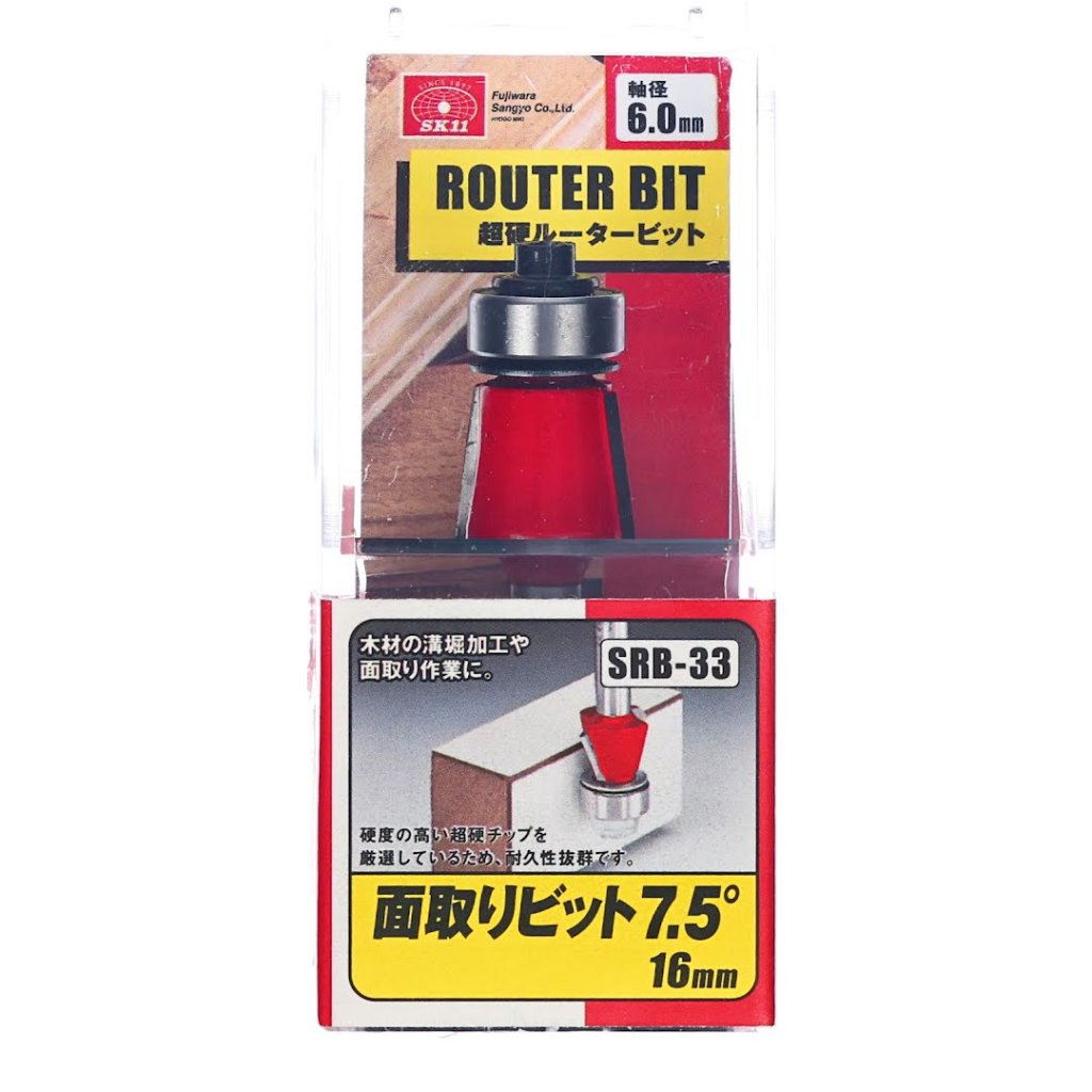 The SK11 Tungsten Carbide Tipped Router Bit, model SRB-33, is ideal for wood chamfering tasks using routers or trimmers. Its high-durability tungsten carbide tip ensures long-lasting performance. With a 7.5-degree bevel angle and a 6 mm shank diameter, it offers precision and efficiency in every cut.