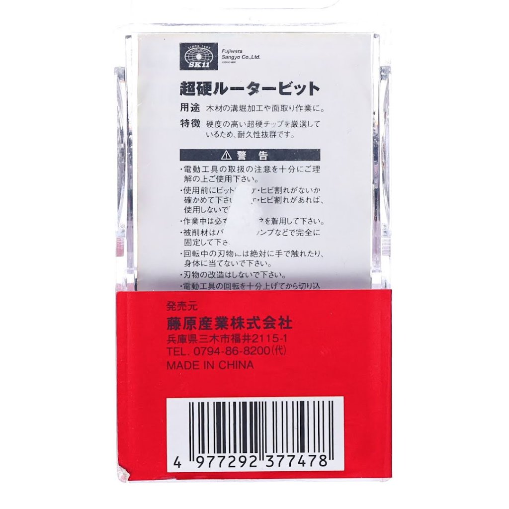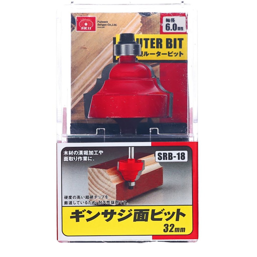 The SK11 Tungsten Carbide Tipped Router Bit, model SRB-18, is ideal for grooving and chamfering wood. This high-quality bit features a durable tungsten carbide tip, ensuring exceptional longevity. With a 32 mm size and a 6 mm shank diameter, it is designed for precision trimming tasks. The bit measures 32 mm in width, 70 mm in height, and 32 mm in depth, weighing 120 g.