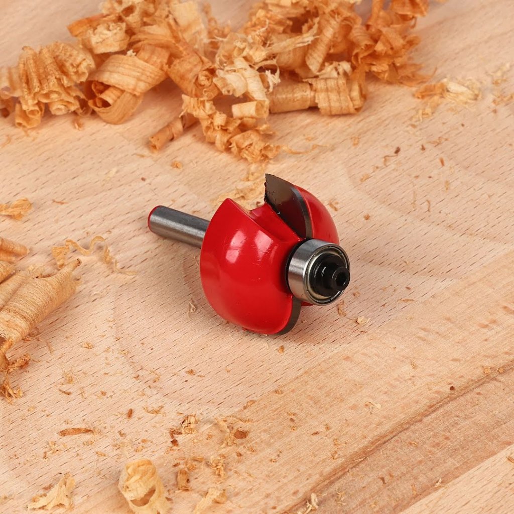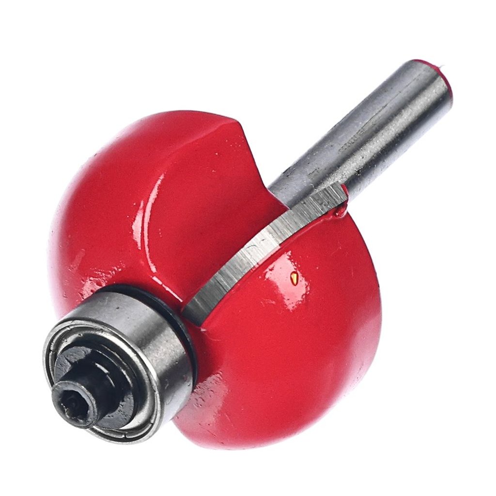 The SK11 Tungsten Carbide Tipped Router Bit, model SRB-21, is ideal for grooving and chamfering wood. This core box router bit features a high-hardness carbide tip for exceptional durability. The bit measures 32 mm wide, with a 6 mm shank diameter and a 12.7 mm ball bearing. It is perfect for precise woodworking tasks.