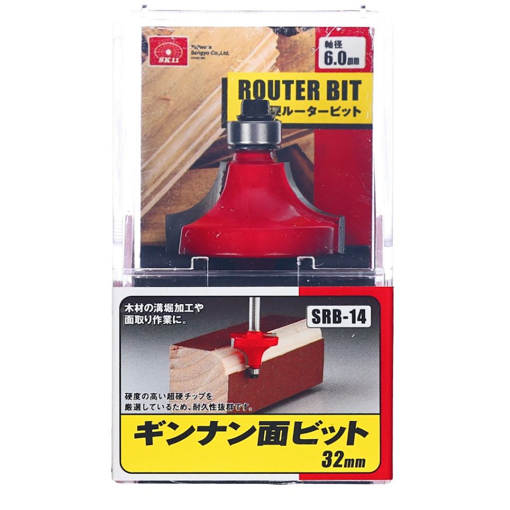 The SK11 Tungsten Carbide Tipped Router Bit, model SRB-14, is ideal for grooving and chamfering wood. It features a 32 mm diameter with a 6 mm shank and is suitable for various woodworking tasks. The high-hardness tungsten carbide tip ensures exceptional durability and precision.