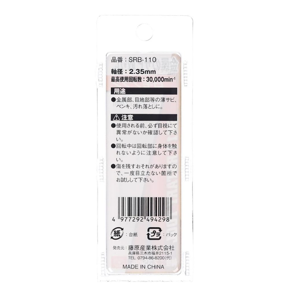 The SK11 Wire Cup Brush, model SRB-110, is ideal for removing light rust, paint, and dirt from metal surfaces and joints. This 17 mm cup-shaped brush features a 2.35 mm shank and can be used for polishing with abrasive compounds. It is particularly effective for prepping surfaces on figures and plastic models. Ensure safe operation within the 30000 RPM permissible rotation speed.