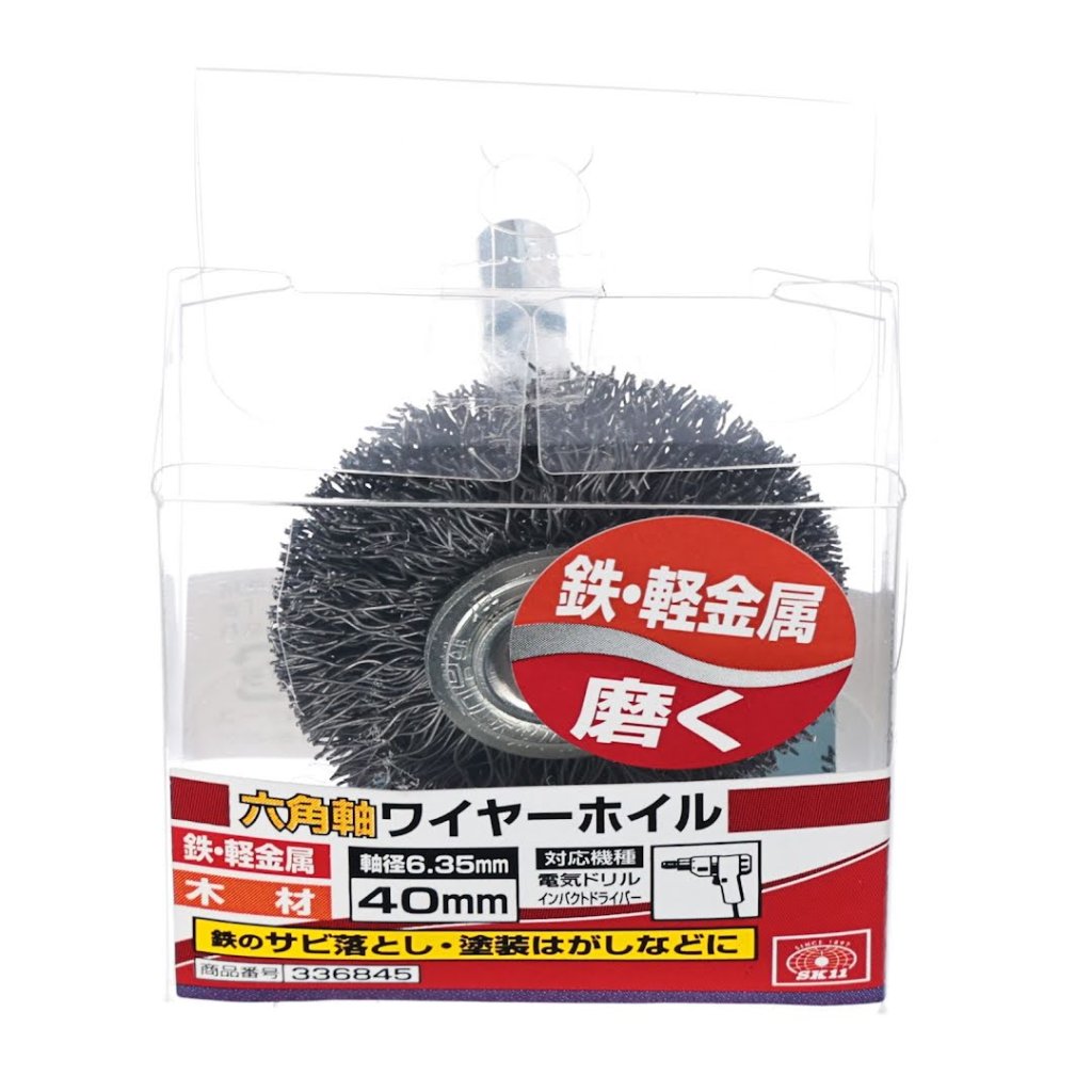 The SK11 Wire Wheel Brush is ideal for removing rust, paint stripping, and deburring on iron and light metals. It is 40 mm in diameter and features a 6.35 mm hex shank for easy attachment to electric drills and impact drivers. This versatile tool can also be used for finishing tasks on uneven wood and roots.