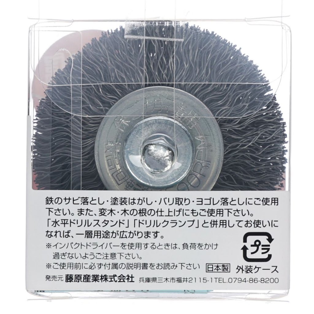 The SK11 Wire Wheel Brush is designed for rust removal, paint stripping, and burr cleaning on iron and light metals. Its 6.35 mm hex shaft easily attaches to impact drivers and electric drills for versatile use. It also excels in cleaning and polishing pipe interiors and finishing roots of trees and wood. The wheel's diameter is 50 mm and it weighs only 80 g.