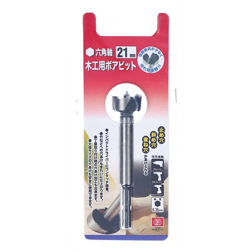 The SK11 Woodworking Bore Bit (21 mm) is expertly designed for precision drilling in wood and bamboo, featuring a hexagonal shank that ensures a secure fit in impact drivers, cordless drills, and electric drills. Its special tip shape and relief angle cutting edge minimize cutting resistance, allowing smooth and efficient drilling. Ideal for various woodworking tasks, this bit excels at creating stop holes, angled holes, and overlapping holes with clean edges. The durable construction and user-friendly design make it an essential tool for professional and DIY woodworking projects.