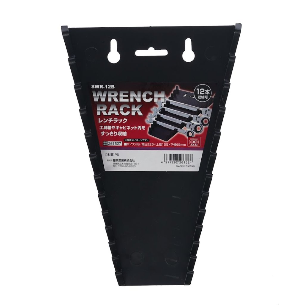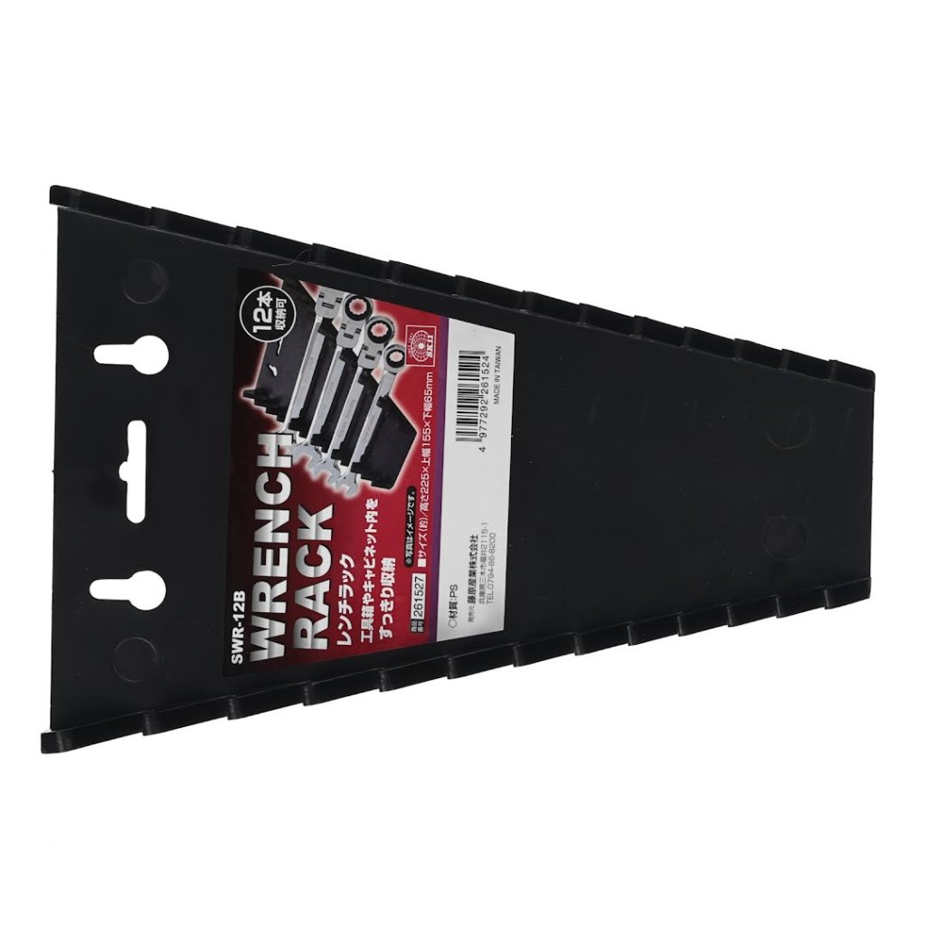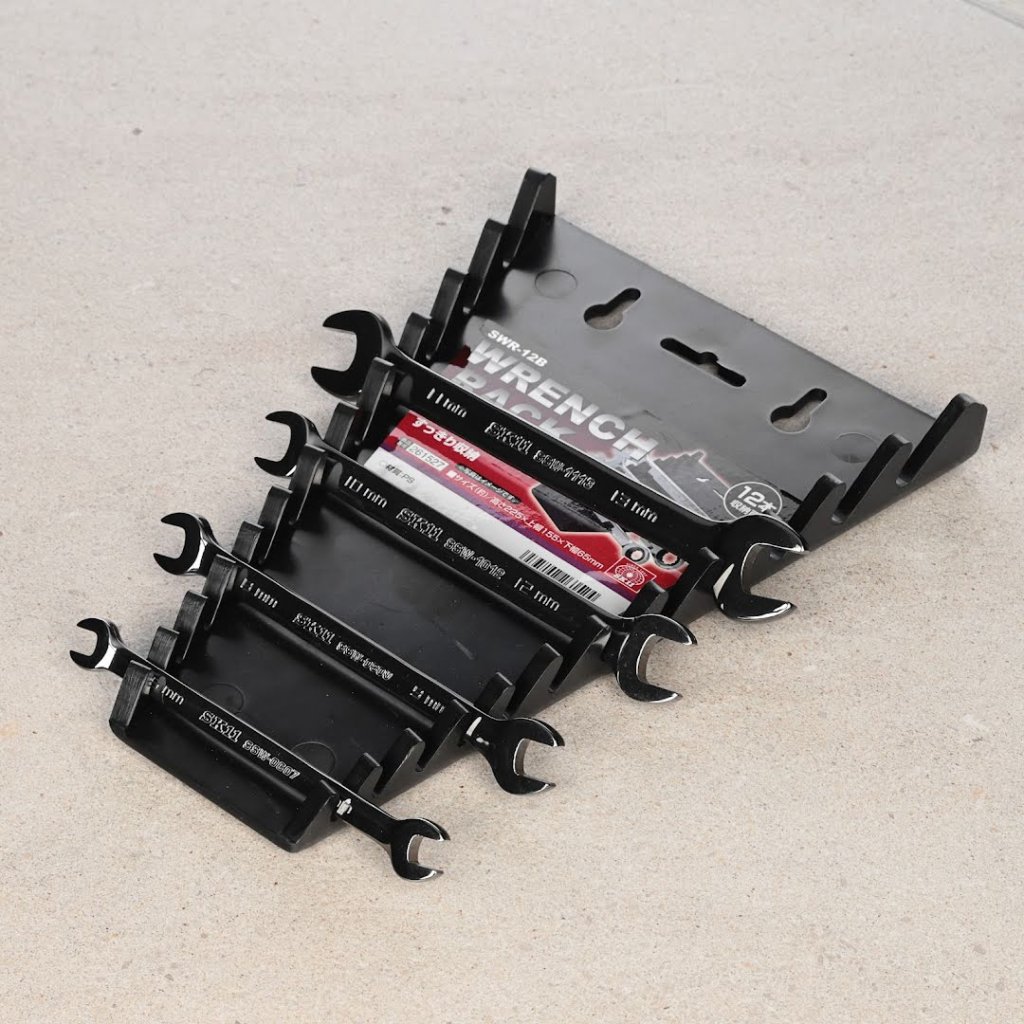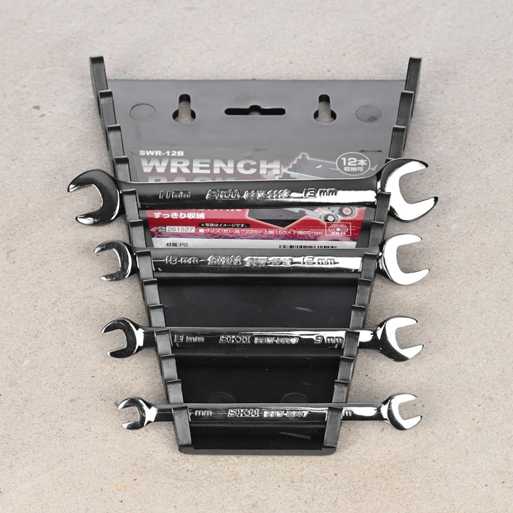 The SK11 Wrench Rack, model SWR-12B, is designed to neatly organize up to twelve wrenches, including spanners, combination, and box-end wrenches. Its compact 155 mm width, 227 mm height, and 25 mm depth ensure it fits well in various storage spaces. The rack features a hook hole for wall mounting, making it a versatile addition to your workshop. The clear arrangement allows for easy size identification, facilitating quick selection and improved workflow. Weighing just 160 g, this durable rack is an essential tool organizer for any DIY enthusiast or professional.