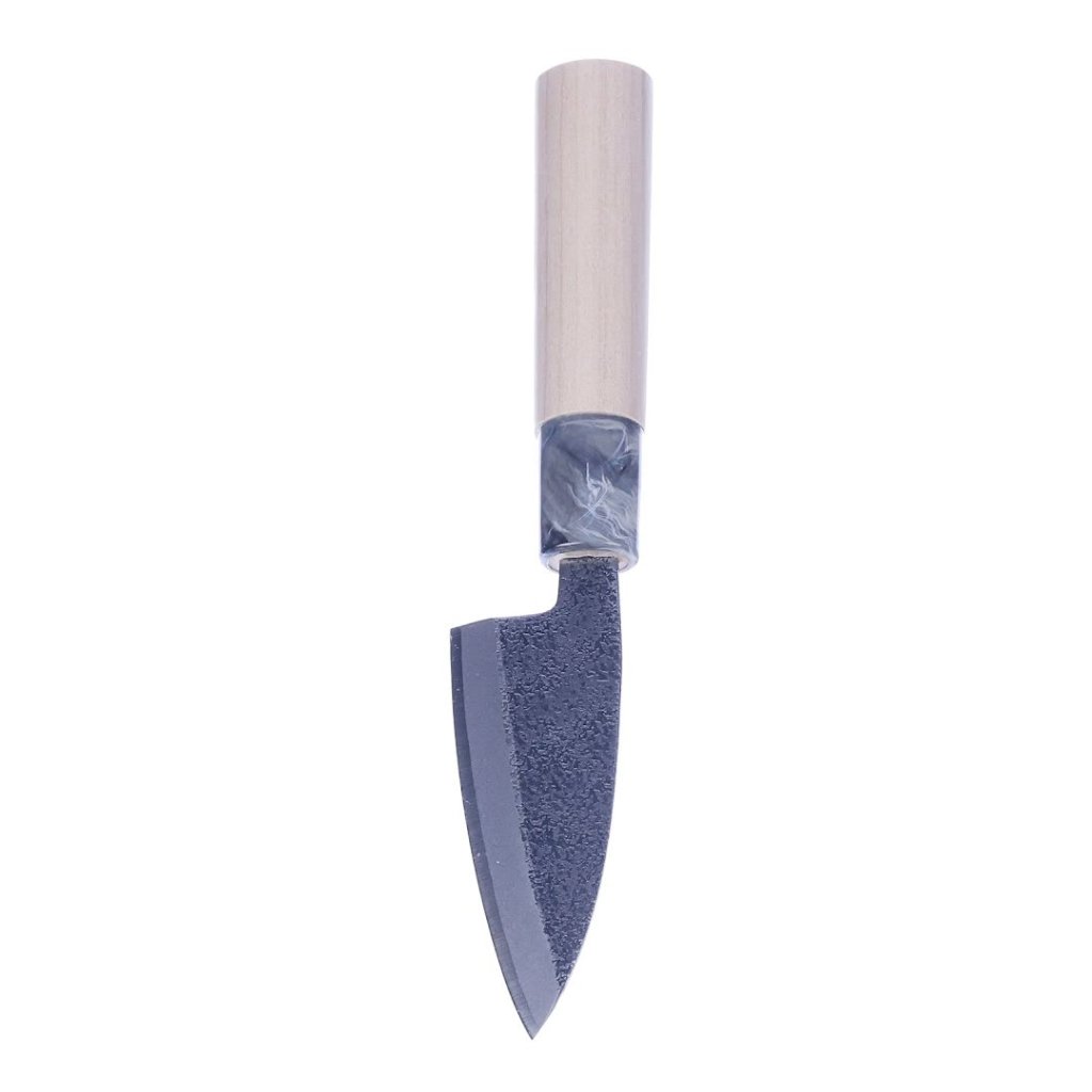 The UMEBACHI RYUMA Japanese Small Deba Knife, with its distinctive hammertone finish and 90 mm long blade, embodies the perfect fusion of traditional craftsmanship from Banshu Miki and innovative technology. Designed for precision in filleting small fish like horse mackerel and red snapper, this knife is ideal for tasks such as three-piece filleting, bone cutting, and helmet splitting. Its compact size ensures easy handling, making it a must-have tool in any kitchen. Please use this knife only for its intended purpose and avoid cutting hard or frozen materials to maintain the blade's integrity..