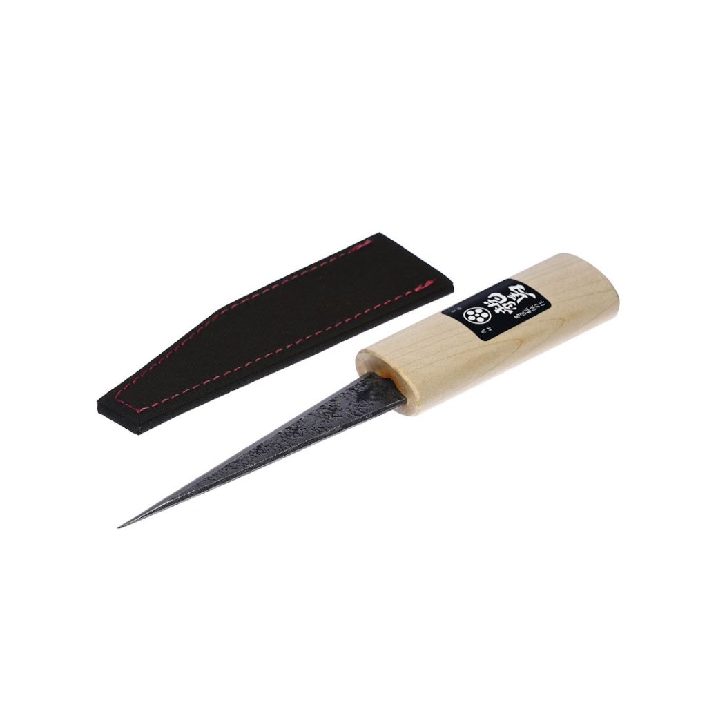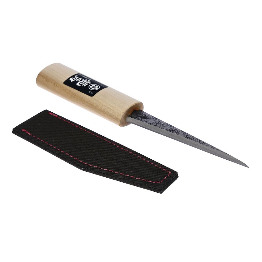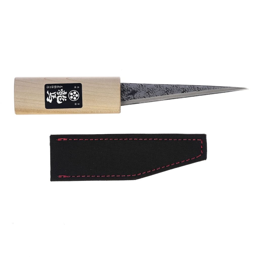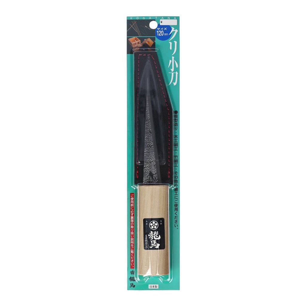 The UMEBACHI RYUMA Kuri-Kogatana Japanese Knife is ideal for woodworking, bamboo crafting, and various detailed tasks. This 120 mm blade offers exceptional sharpness, perfect for intricate work. It has a durable sheath to protect the blade when not used. The knife's edge can be resharpened using a whetstone, ensuring long-term functionality. The product dimensions are 31.5 mm wide, 221 mm high, and 17 mm deep, with a weight of 56 g, making it a precise and handy tool for fine craftsmanship.