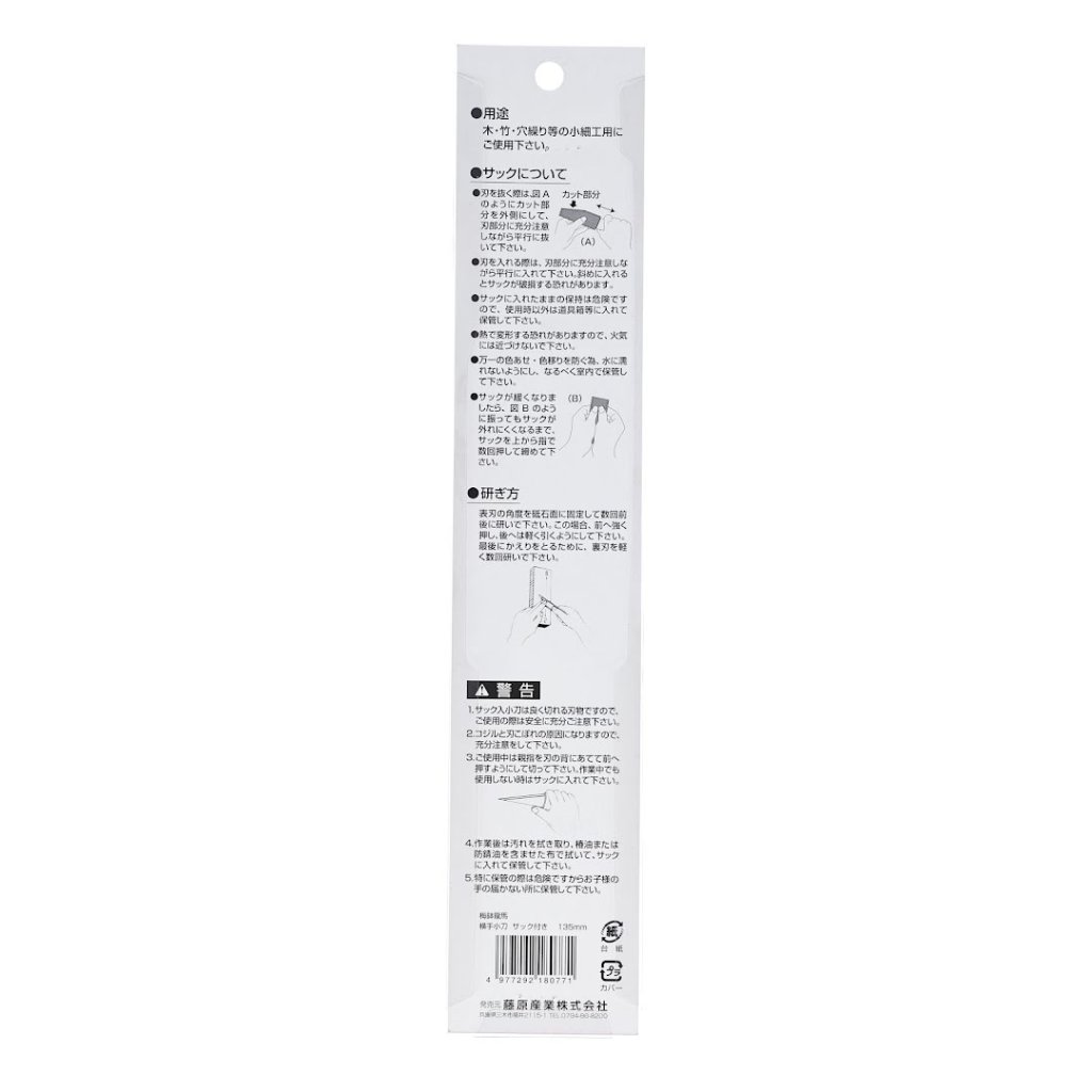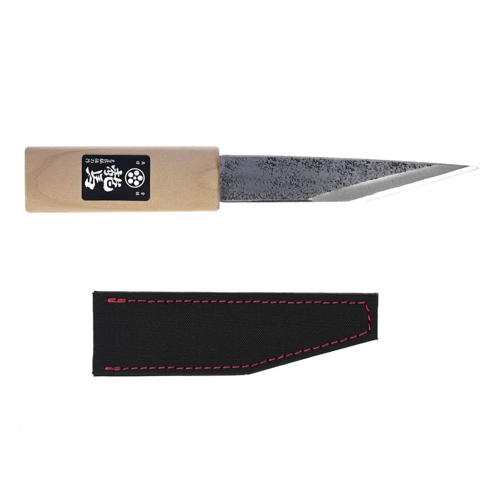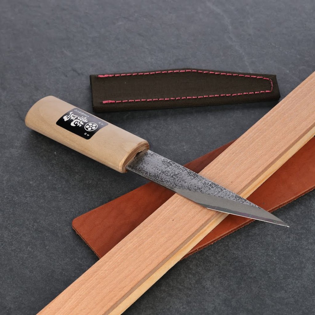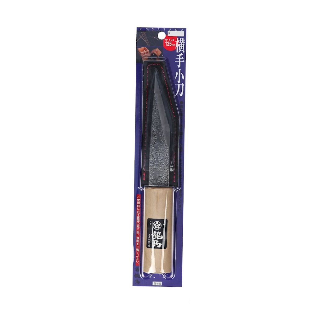 The UMEBACHI RYUMA Yokote-Kogatana Japanese Knife is ideal for woodworking and bamboo crafting. Its 135 mm blade length features a sharp, durable edge tailored for precision tasks. The included sheath protects the blade and enhances its longevity. If the blade dulls, it can be resharpened with a whetstone. The knife's overall weight is 91 g, making it lightweight and easy to handle.