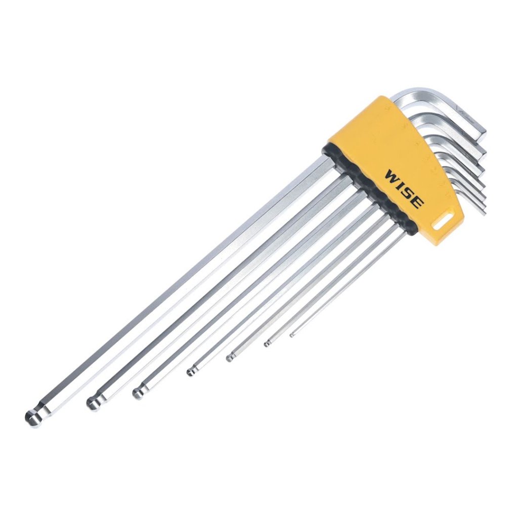 The WISE Ball End Hex Key L-Wrench Set is designed for precision and durability. Its ball-point tip allows for more effortless tightening and loosening of hex bolts even at an angle, making it highly versatile for all projects. Each wrench is hard chrome-plated for added strength and resistance to wear and corrosion. The set includes sizes 1.5/2/2.5/3/4/5/6 mm, each marked on the wrench for easy identification. Ideal for tightening or removing hex socket bolts, this long set combines high torque capacity with resistance to stripping, providing a reliable tool for both professional and DIY use.
